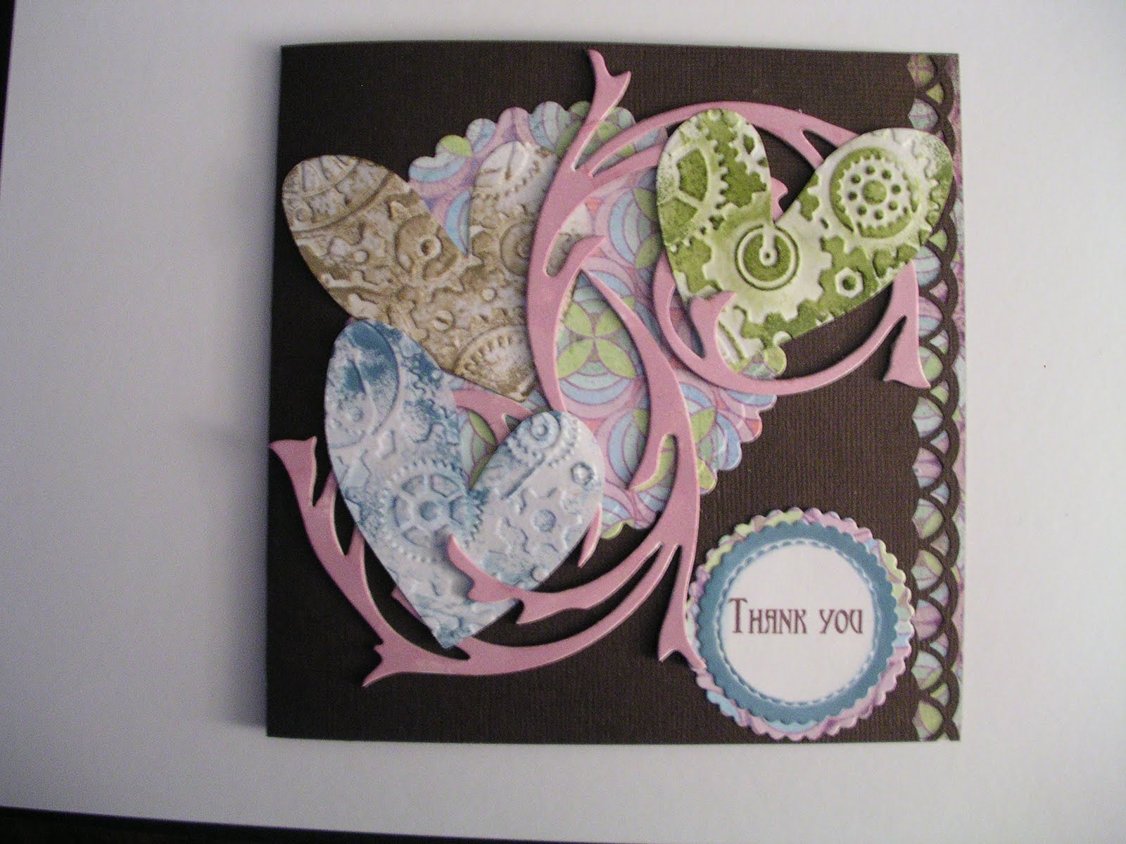 I cut out the background heart from the Heart Wings and embossed them with the Cuttlebug gear folder. I embossed the raised gears with clear embossing powder and then swiped the hearts with the Distress ink for embossed resist. I missed some spots but I still like how they turned out!